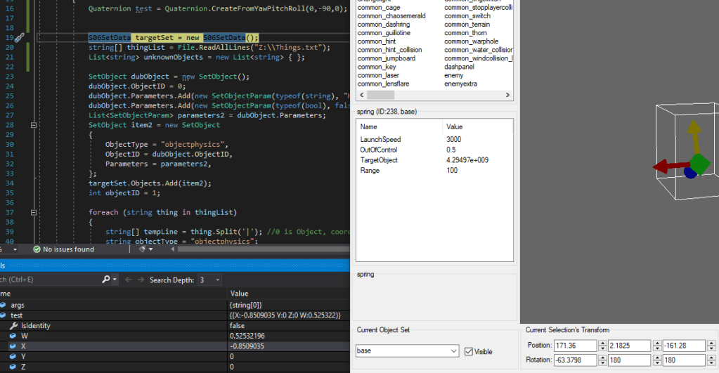 At some point, I hit upon the idea of using SonicGLVL (the Sonic Generations Level Editor) to visualise the object placements. This mostly came about due to me remembering that object rotations in Generations SET Files are also Quaternions, so I could copy and paste their values to get the rotations correct. While I was still hand typing everything, this made it easier to determine object placements, especially considering Shadow The Hedgehog could spawn multiple Rings from one Ring object, a feature ‘06 lacks, as a result, I always had to guess the right coordinates for the other Rings with no way to check it without booting up the game, whereas GLVL allowed me to at least visually eyeball it.