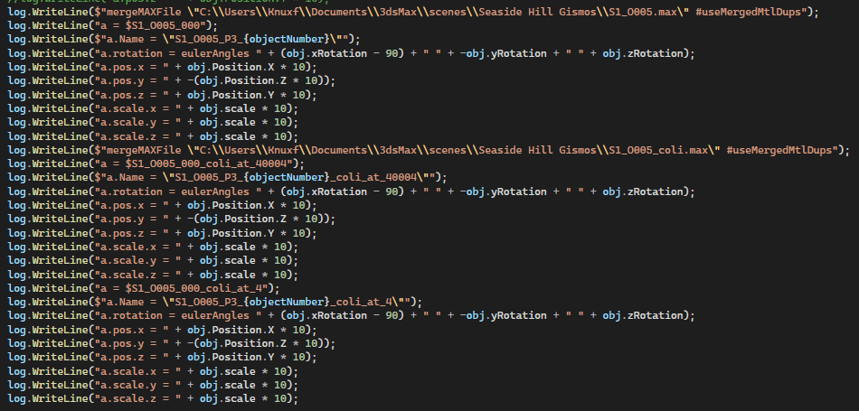 A modification of my reading code was used for this, exploiting an INI export option in HeroesPowerPlant and then sloppily reading that. I did it this way for those so I could read the miscellaneous data, as platforms like these have a scale value which I needed to take into account. As for actually importing them, I did the same thing as I did for the Flowers in Greenflower Zone, which was creating a 3DS Max script file that merged in another Max file for the object itself. Was it sloppy? Eh probably but hey it worked so I can’t complain.