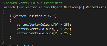 This code simply loops through every vertex in an object’s model and, if it has a Y position of 1 or higher (which would put it above the water) sets their R, G and B values for their Vertex Colours to 255, pure white, effectively removing the colour.