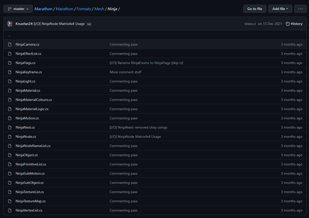 In December of 2021, I finally decided to have another shot at writing Ninja support into Marathon (as we’d since rebooted the project from scratch for a cleaner codebase). The Object stuff turned out to be mostly smooth sailing, with reference to Rad’s spec, the Kyozoress XTO and my old code. My focus this time was to keep the code manageable, and try and make the files Marathon saved more accurate (which lead to a lot of headaches and a game of whack-a-mole when it came to materials). As a result of this focus leading me to keep different parts of the library separate from one another… Well… Most formats in Marathon can be handled neatly in one file. Ninja? Ninja has…
