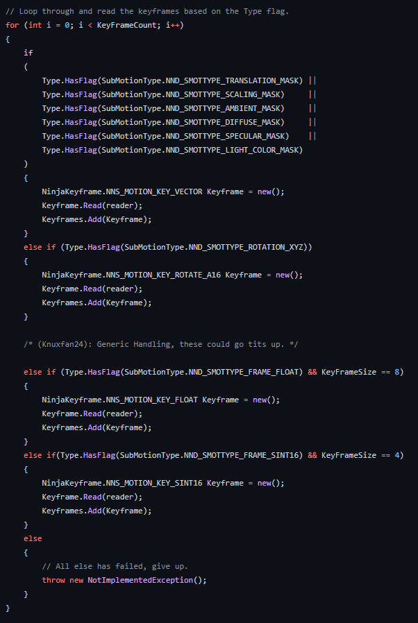Ninja Motion Keyframe entries (in a similar way to the Vertex Lists above) can be of a variable length, however, the data in the different types can be so different that my workarounds for the Vertices wouldn’t work here. My first thought was to check if the Type called for a Floating Point Number or a Signed 16-Bit Integer and then go from there. But this plan failed once Vector3s were thrown into the mix, as I had no way of knowing if something with a Floating Point Number was a single number or a Vector3. Even with Rad trying to explain it to me, it just went in one ear and out the other (which tends to happen when my brain just decides to not hold onto information). As it turned out, Signed 16-Bit Integers also had versions where there were three values after the Keyframe Index rather than just one, leading to the exact same problem.